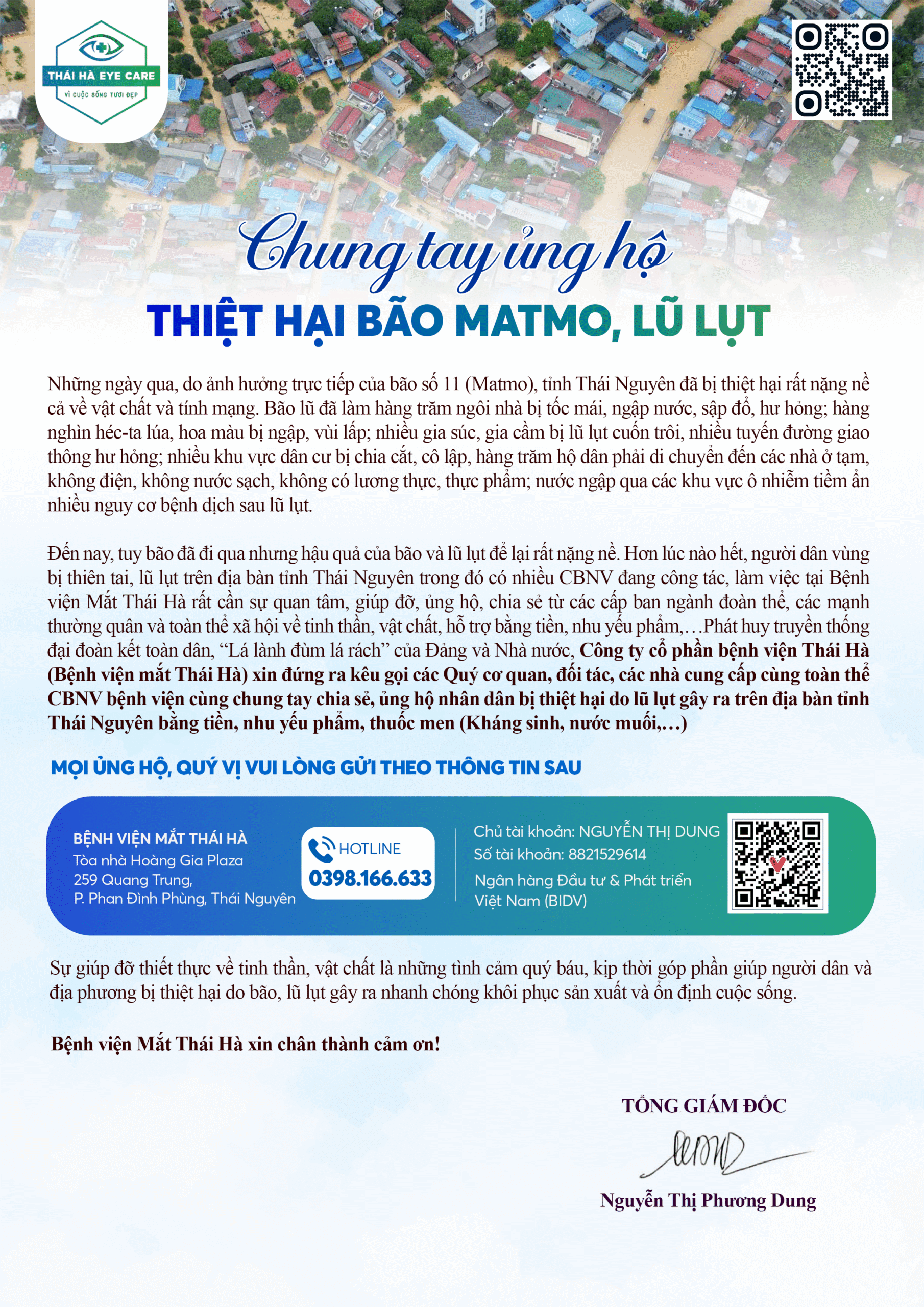 Đến nay, tuy bão đã đi qua nhưng hậu quả của bão và lũ lụt để lại rất nặng nề. Hơn lúc nào hết, người dân vùng bị thiên tai, lũ lụt trên địa bàn tỉnh Thái Nguyên trong đó có nhiều CBNV đang công tác, làm việc tại Bệnh viện Mắt Thái Hà rất cần sự quan tâm, giúp đỡ, ủng hộ, chia sẻ từ các cấp ban ngành đoàn thể, các mạnh thường quân và toàn thể xã hội về tinh thần, vật chất, hỗ trợ bằng tiền, nhu yếu phẩm,…Phát huy truyền thống đại đoàn kết toàn dân, “Lá lành đùm lá rách” của Đảng và Nhà nước, Công ty cổ phần bệnh viện Thái Hà (Bệnh viện mắt Thái Hà) xin đứng ra kêu gọi các Quý cơ quan, đối tác, các nhà cung cấp cùng toàn thể CBNV bệnh viện cùng chung tay chia sẻ, ủng hộ nhân dân bị thiệt hại do lũ lụt gây ra trên địa bàn tỉnh Thái Nguyên bằng tiền, nhu yếu phẩm, thuốc men (Kháng sinh, nước muối,…)
